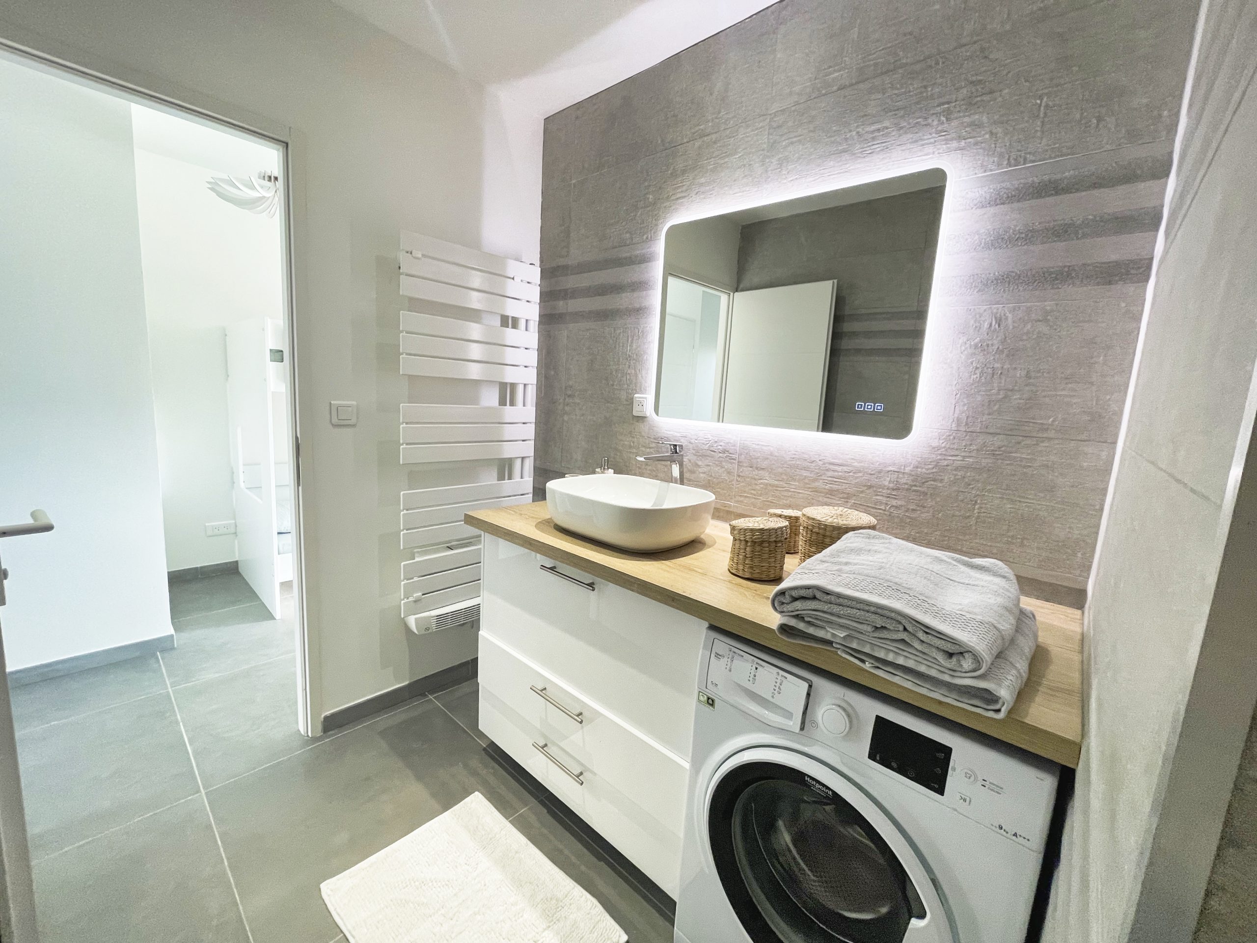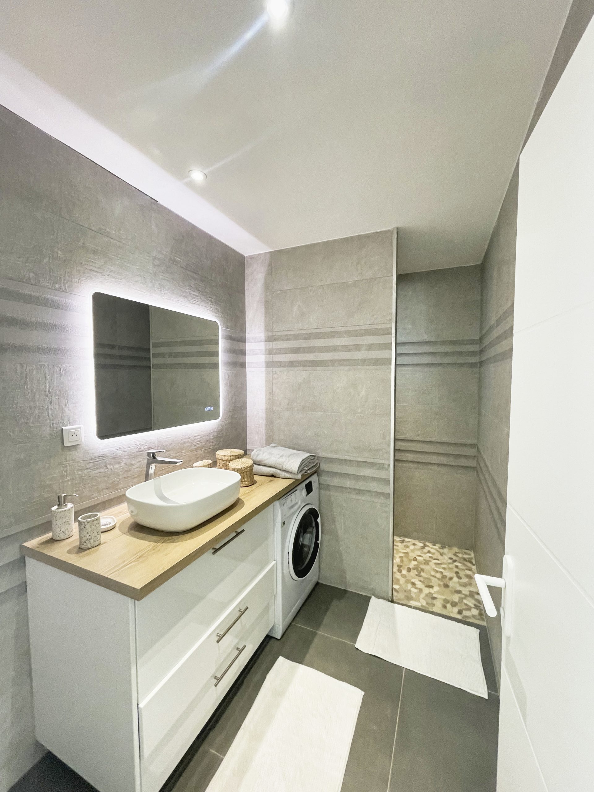La salle de bain est équipée d’une Douche Italienne, radiateur sèche-serviette et d’une machine à laver.
